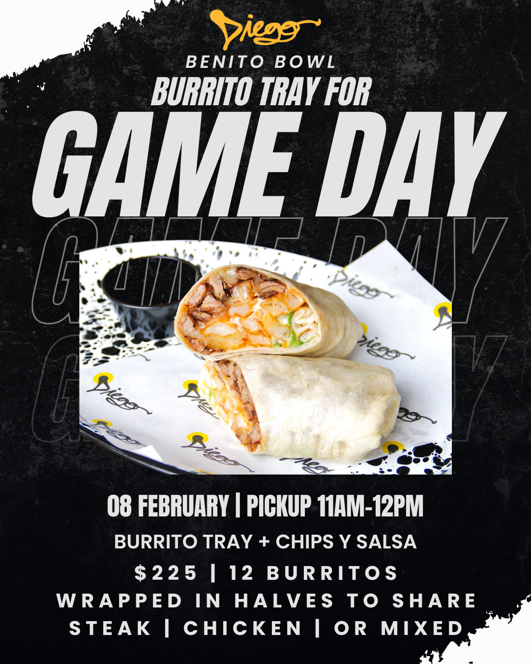 Get your Burrito Tray for Game Day for the Super Bowl on February 8th!