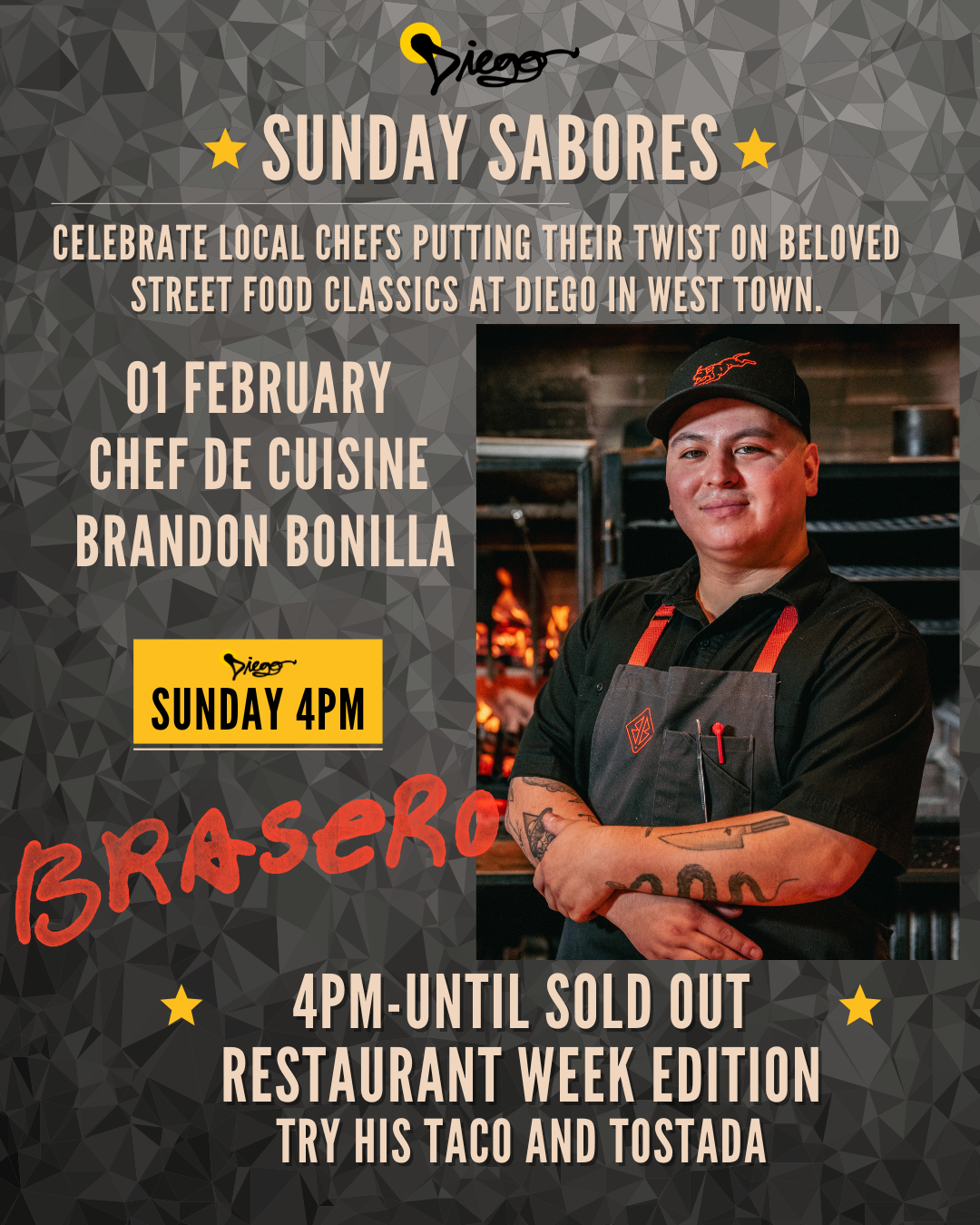 Join us this coming Sunday at 4PM as we welcome Chef Brandon Bonilla of Brasero for Sunday Sabores, Restaurant Week Edition!